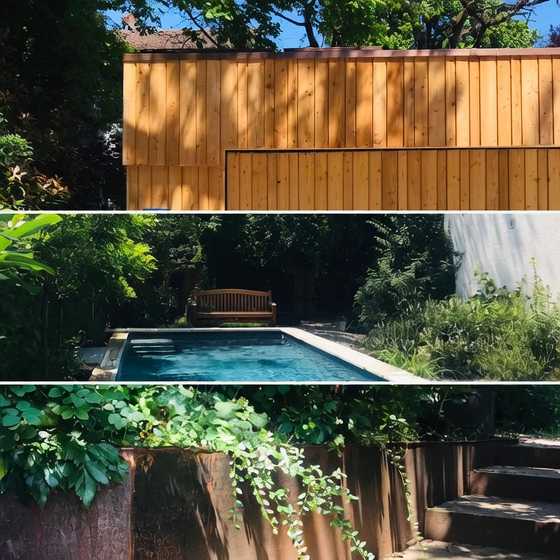 An der Ostseite wurde ein von Büschen umgebener Swimmingpool angelegt.